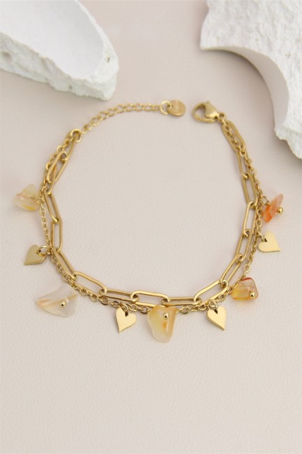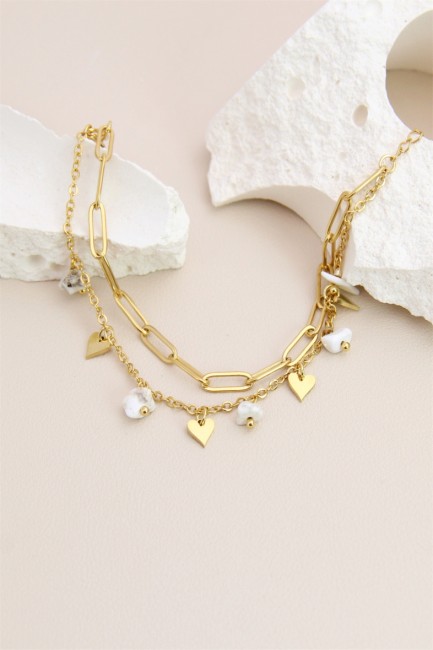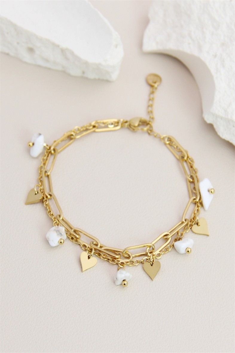 Bracelet double rang pierres naturelles et petits coeurs acier