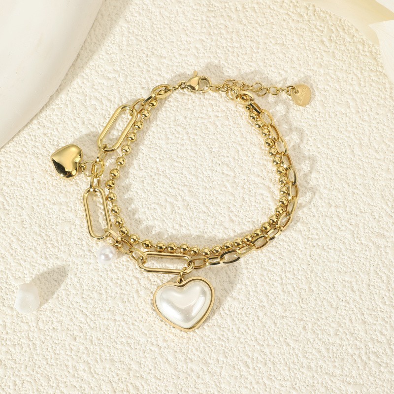Bracelet double rang avec 1 coeur en perle, un en acier et une perle