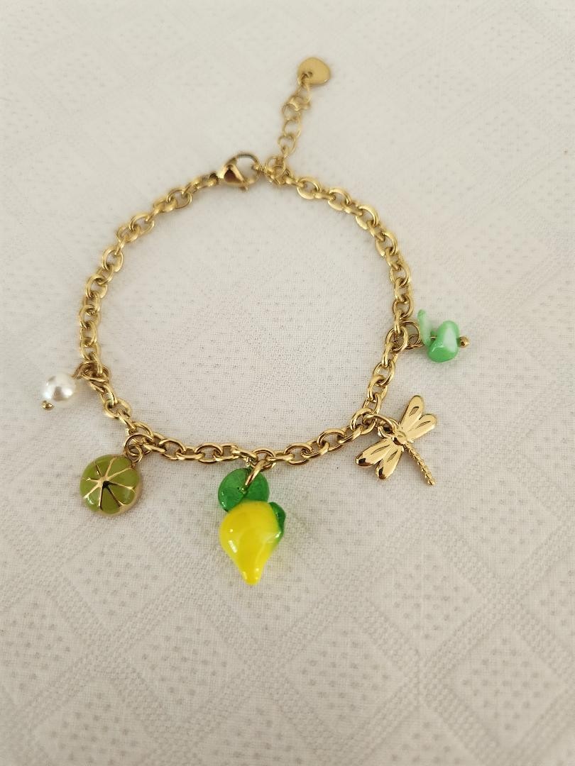 1 Libellule, une perle et une pièce verte avec soleil en acier doré