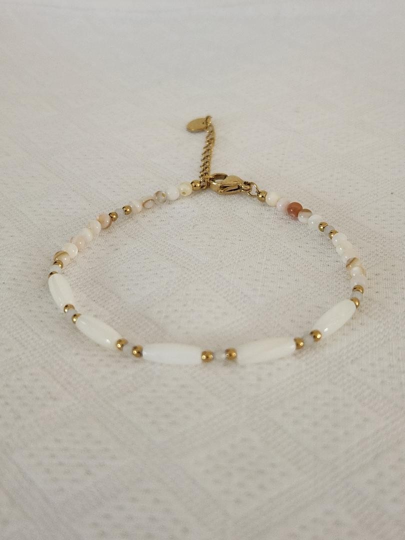 Bracelet perles jade blanc, éclat de nacre et petites boules acier doré