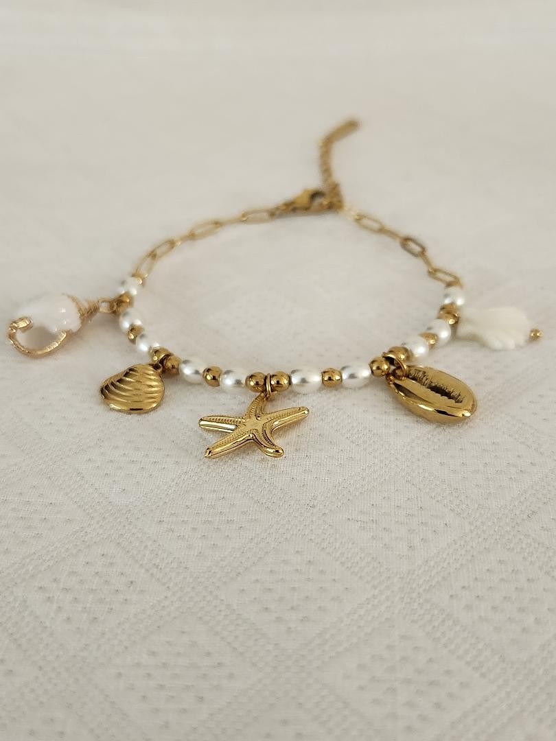 Bracelet chaîne avec 5 breloques, perles d'eau et boules dorées en acier