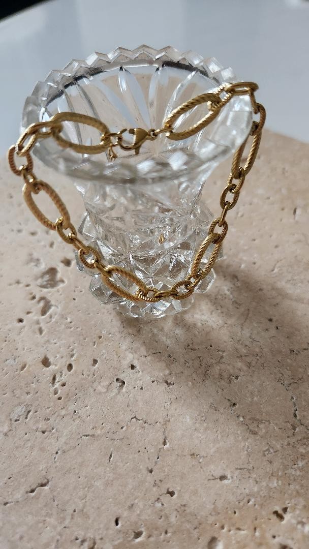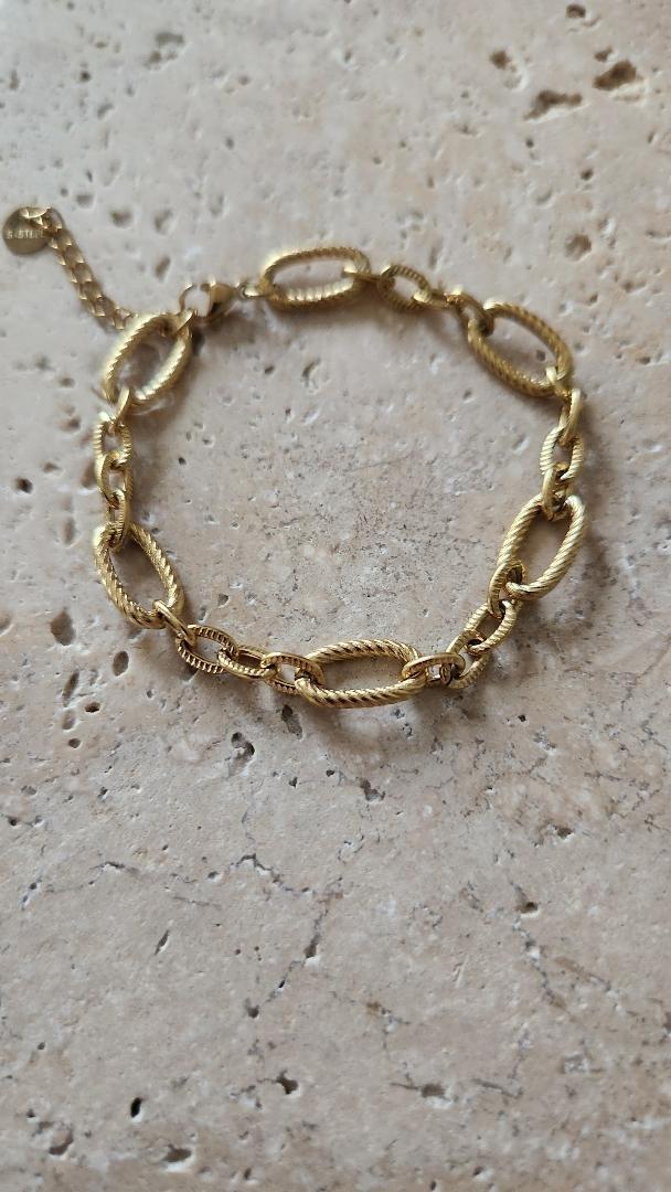 Bracelet acier dore gros maillons texturés séparés par 2 petits maillons texturés